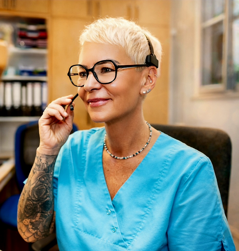 Ältere Frau in blauem Arztkittel mit Brille.